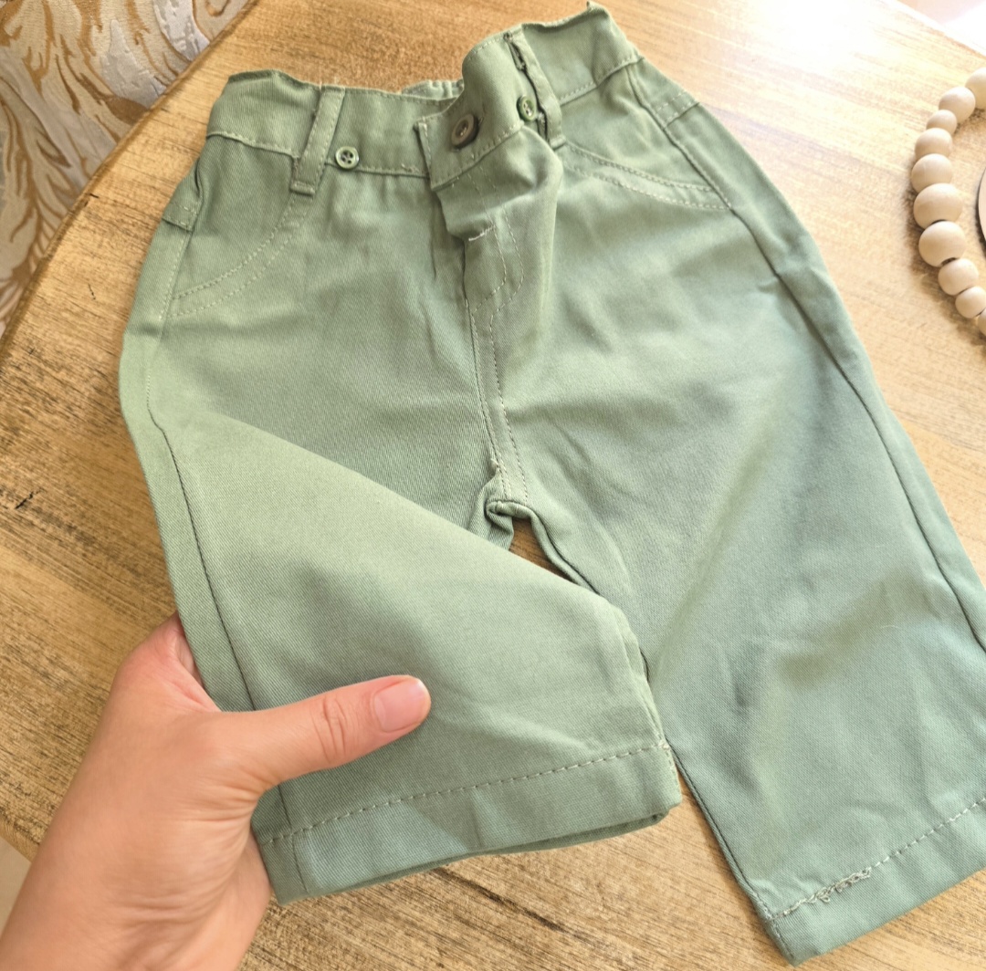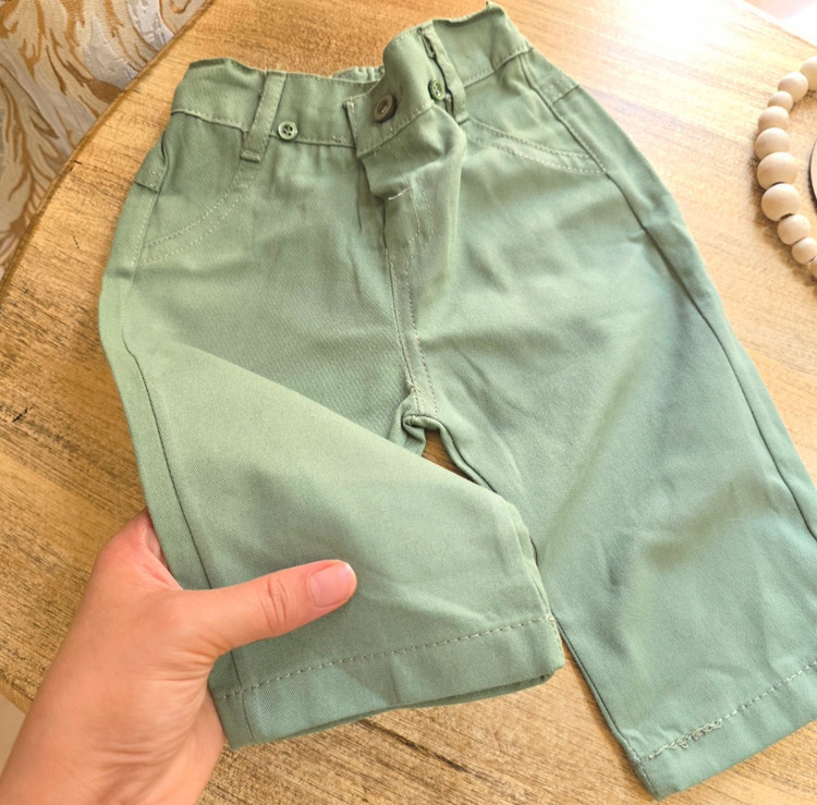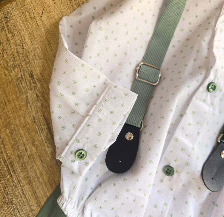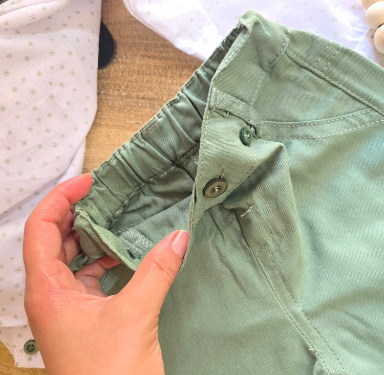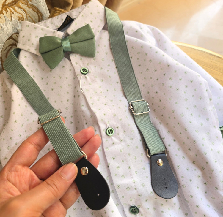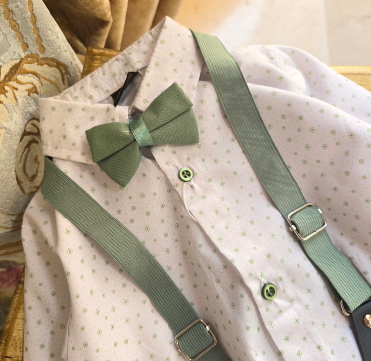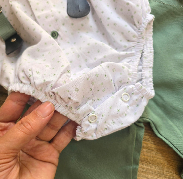 این ست شامل بادی خالدار سفید، شلوار کتان سبز، ساسبند و پاپیون قابل تنظیم هست.